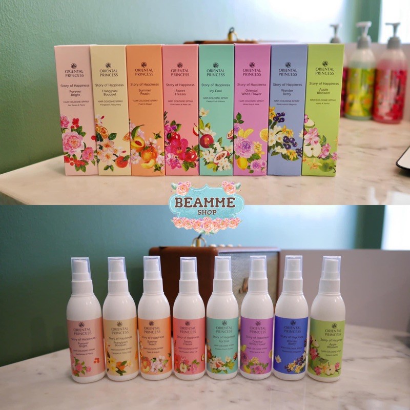 Oriental princess' carefully crafted and fresh fragrance results in a unique hair cologne spray. Lightly spritz on your hair after shower or during the day for your utmost pleasure and confidence. โคโลญจน์สำหรับเส้นผม ช่วยลดกลิ่นไม่พึงประสงค์และปกป้องจากมลภาวะ เพิ่มความมั่นใจว่าผมหอมละมุน มี 8 กลิ่น ให้เลือก 🌸 frangipani bouquet 🌸 white flower 🌸 apple blossom 🌸 icy. Oriental white flower apple blossom frangipani bouquet forever bright. Oriental princess' carefully crafted and fresh fragrance results in a unique hair cologne spray that inspires confidence and liveliness.